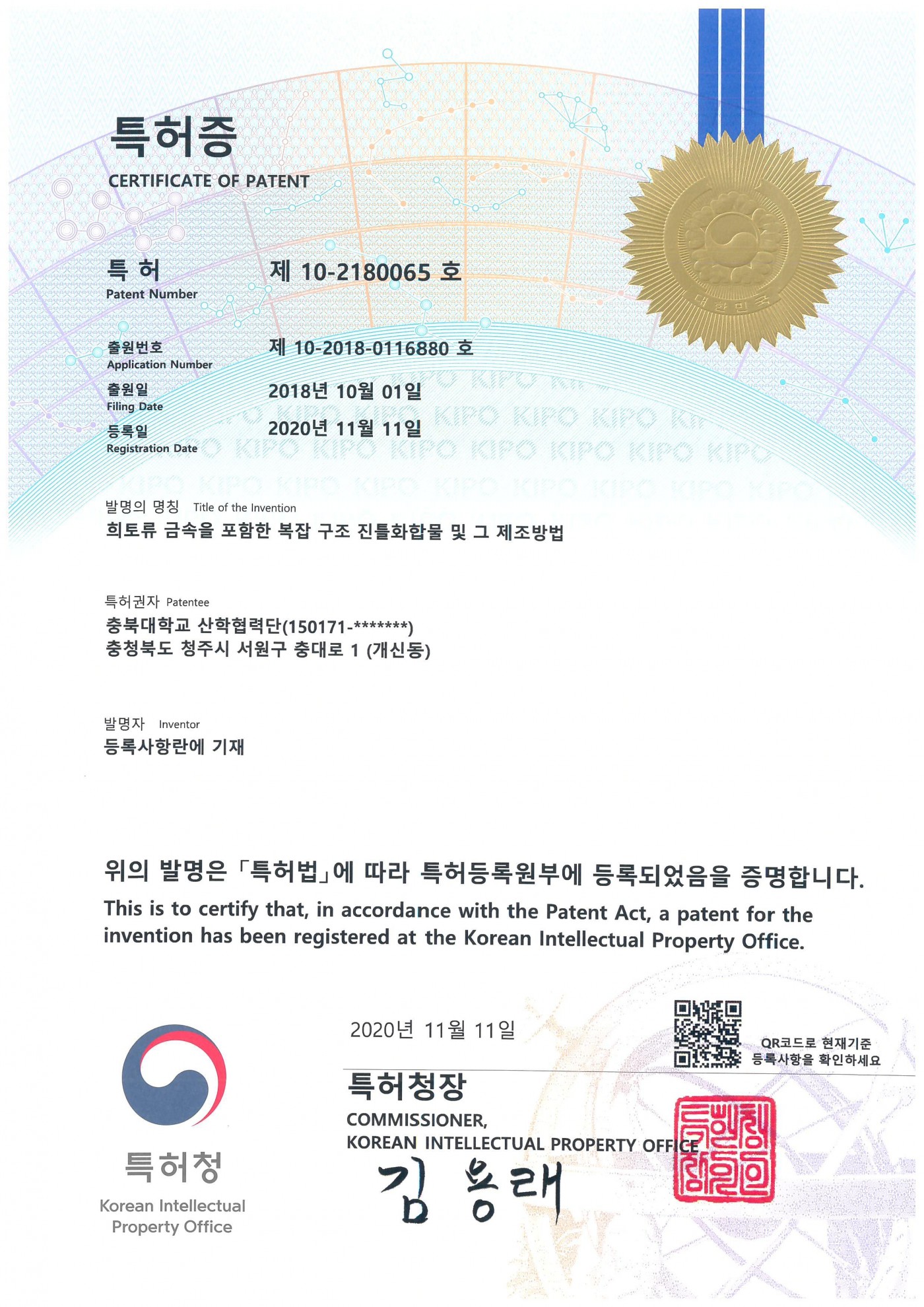 유태수, 이준수, 김기원 "희토류 금속을 포함한 복잡 구조 진틀화합물 및 그 제조방법"에 대한 특허가 등록되었습니다.