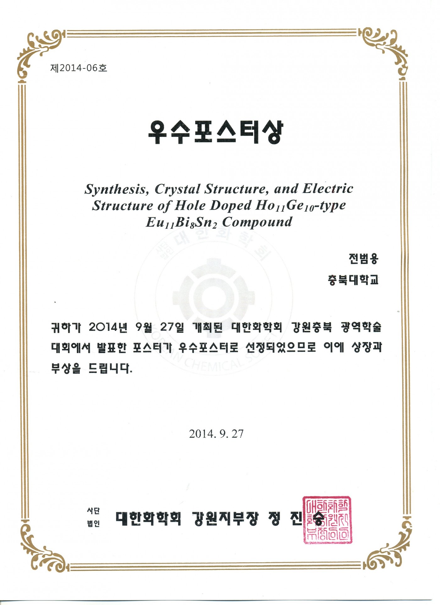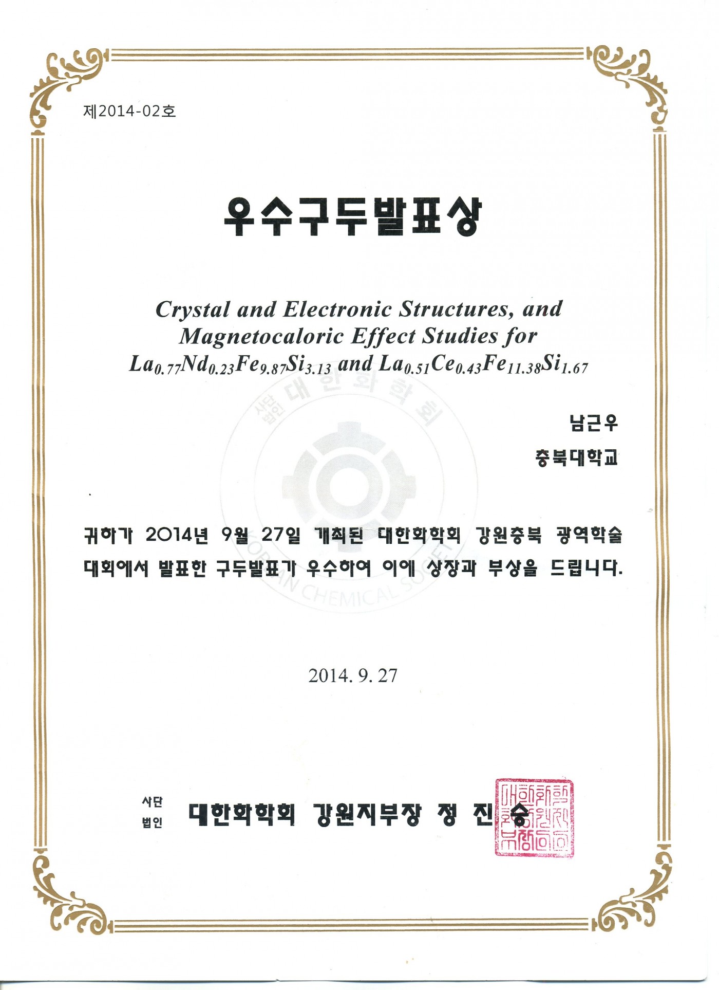 2014년도 KCS 충북/강원지부 광역학술대회 - 우수발표상 및 우수포스터상 수상 (남근우, 전범용 학생)