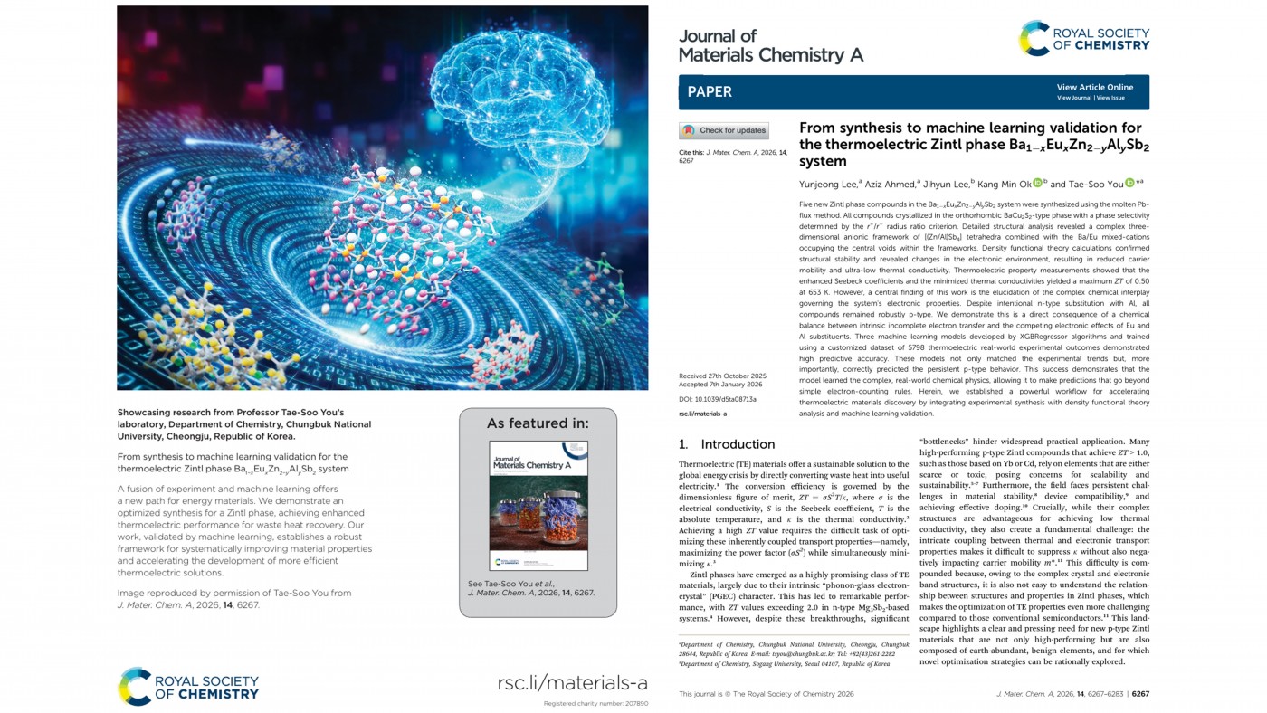 이윤정 학생이 제 1저자로 참여한 위 논문이 'Journal of Materials Chemistry A' 표지논문(Outside Back Cover) 중 하나로 게재되었습니다. 축하합니다!!